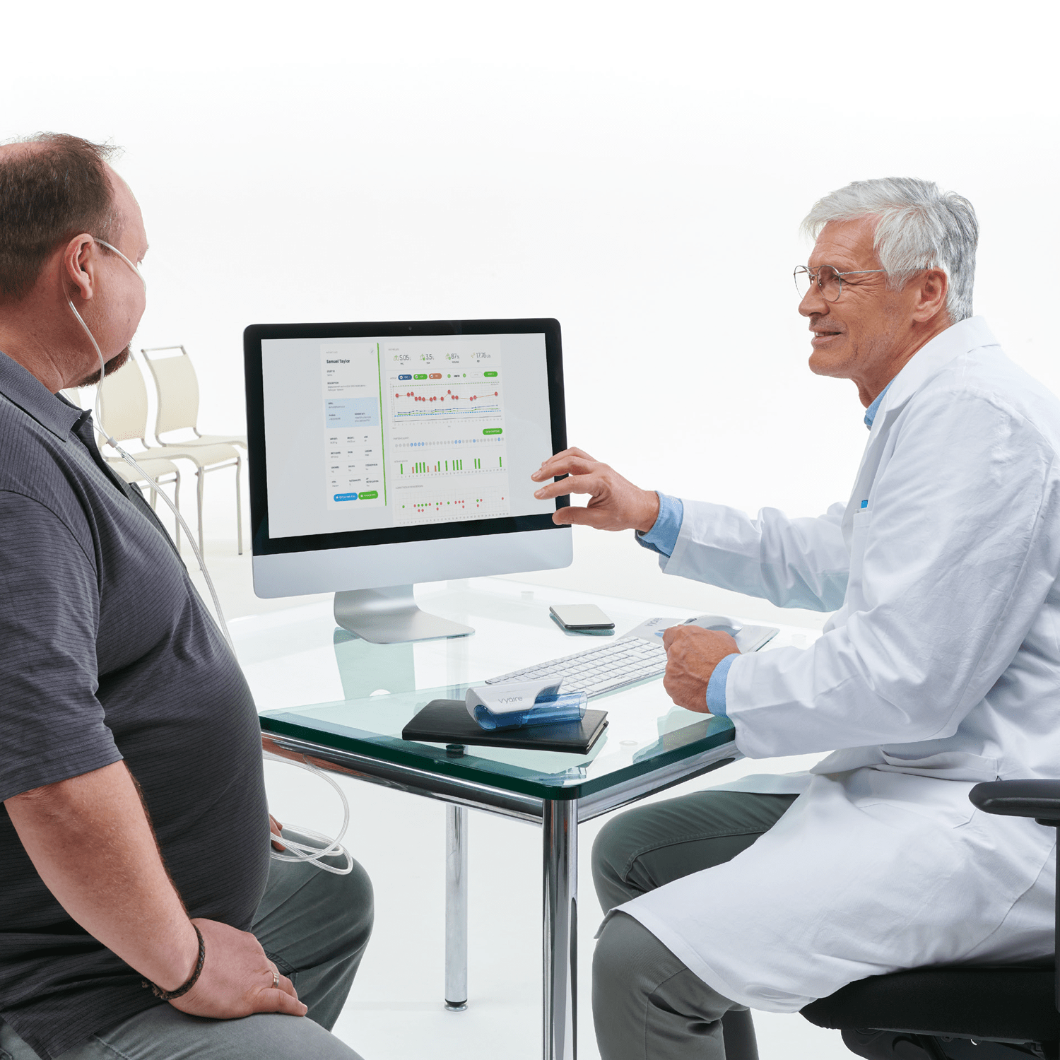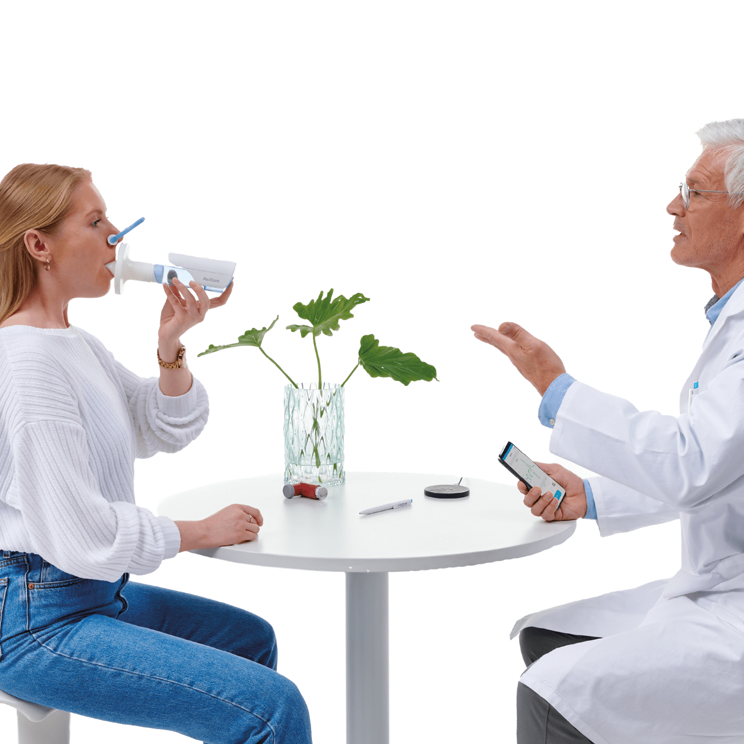 AioCare is a professional system to monitor and treat pulmonary diseases, consisting of a portable hospital-grade spirometer connected to a smartphone app and an online panel to access the results. The device enables a full spirometry test to be conducted in a doctor’s office, including a bronchial challenge workflow. If monitoring needs to go beyond the healthcare system, AioCare may be used for patients at home.