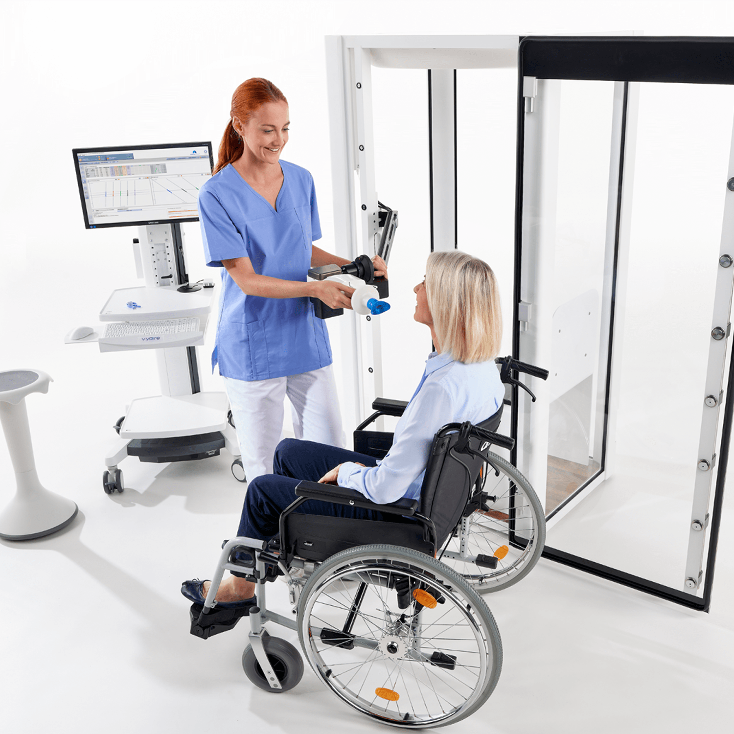 Vyntus BODY readily accommodates wheelchair patients or others who are unable to enter the cabin.  This flexibility makes it easy for the technician. The Telescoping Arm requires little maneuvering effort. It stays right where you place it with no tool or locking mechanisms required.