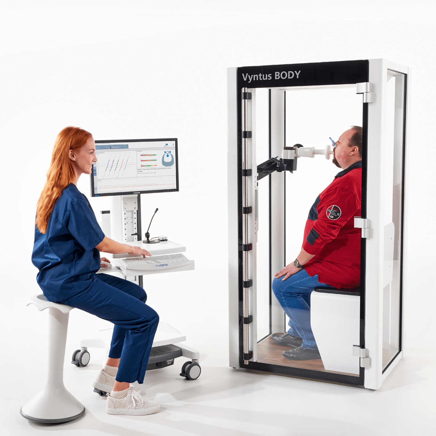 Vyntus BODY offers a spacious plethysmograph (1,110 L) and is equipped with a reinforced bench supporting up to 551 lbs. The all-glass cabin and glowing LED status lights help to create a welcoming environment for most patients.